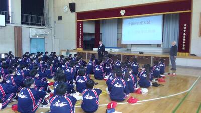 まず、校長先生から、「明日が全てでない。うまくいっても、うまくいかなくても、安全に、無事に帰ってくること。試験会場で緊張したら、周りを見回してごらん。(みんな緊張しているはず。)明日は、みんなが実力を発揮できるよう、学校で応援しています。」とお話がありました。