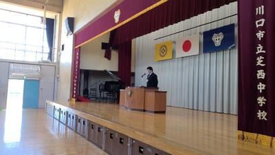 校長先生からは、「何度でもチャレンジすることについて、大切なことは、学習も、部活動も、人間関係も失敗しないことでなく、失敗しても立ち上がることです。芝西中学校は、生徒の皆さんを全力で応援していきます。」とお話がありました。
