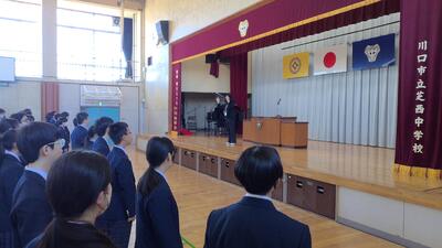 続いて、校長先生から、「自分の夢や目標に近づけた1年であったかを振り返り、春休みに、4月からの夢や目標について考えてほしい。」とお話がありました。来年度も、夢や目標にまい進する芝西中生の姿を期待します。